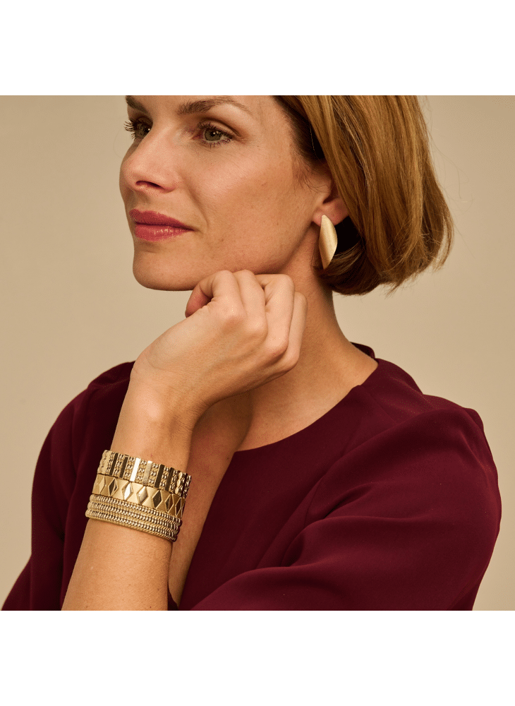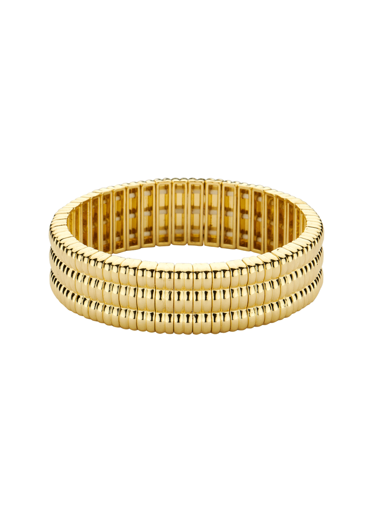 De CAB60 armband volledig in goud is een opvallende eyecatcher binnen de CAB reeks Het gestapelde ontwerp straalt kracht en elegantie uit Draag hem solo voor een uitgesproken look of combineer met een contrasterend model zoals de geometrische CAB61 of de matte CAB65 voor een gelaagde stijl vol karakter