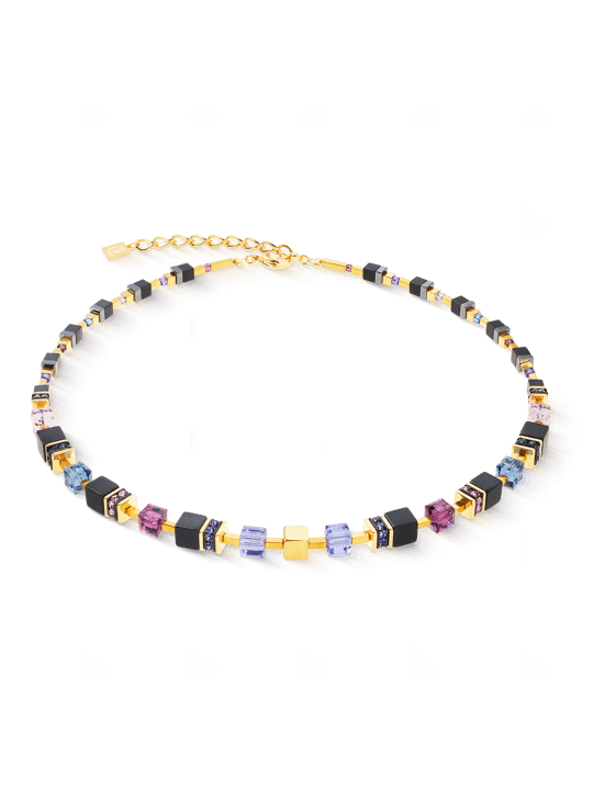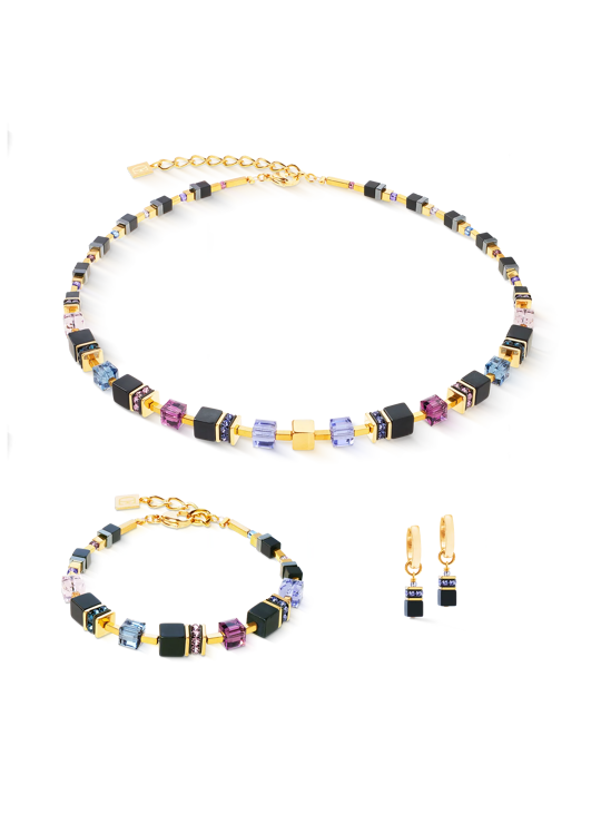 Klassiek design gecombineerd met gedurfde kleuraccenten: GeoCUBE®-kubussen van 6 mm in middernachtblauw, violet, roze en ijsblauw combineren met diepzwarte onyx en sprankelende kristallen voor een opvallend ensemble. Slanke rechthoekige elementen van goudkleurig hematiet zorgen voor elegante accenten tussen de stenen. Aan de achterkant loopt de steen licht taps toe voor optimaal comfort – een werkelijk verfijnd sieraad.