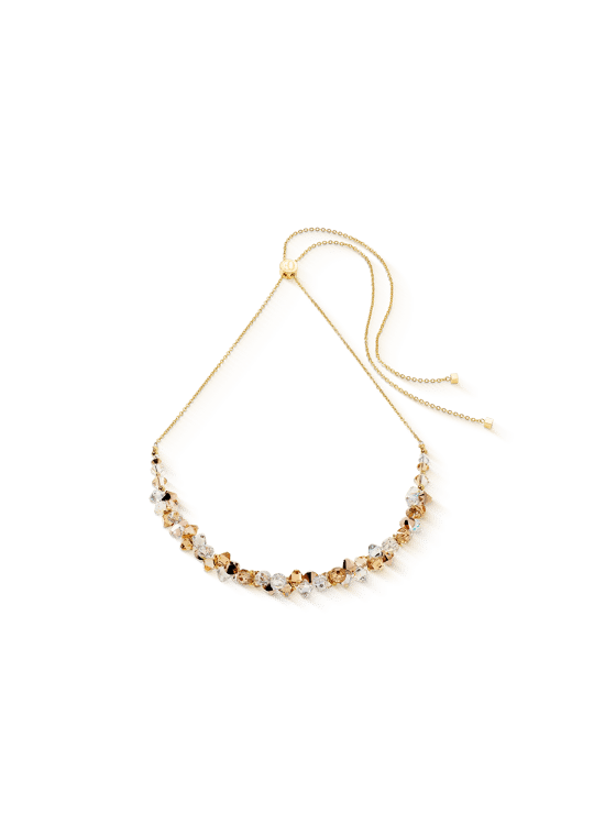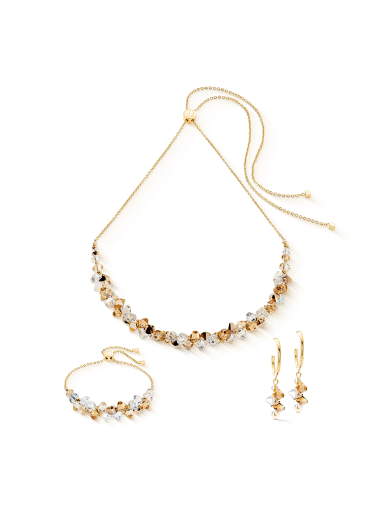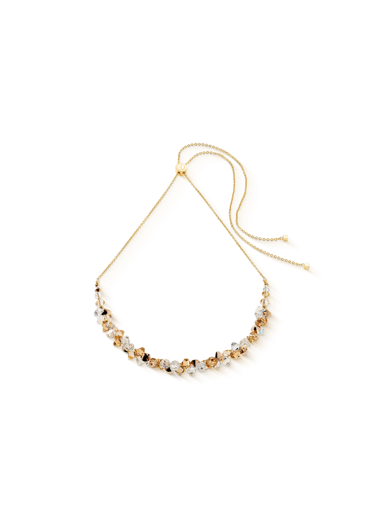 Dancing Crystals Goud-Beige Ketting - Sprankelende Lichtheid in Beweging. Deze ketting is een van onze bestsellers en is nu verkrijgbaar in een elegante nieuwe kleurvariant. Sprankelende Swarovski®-kristallen in warm beige en stralend wit dansen met elke beweging als kleine lichtpuntjes op een delicate vergulde roestvrijstalen ketting. Dankzij de schuifsluiting kun je de kettinglengte traploos aanpassen van 30 tot 70 cm, waardoor je hem veelzijdig kunt dragen: dicht om je nek voor een moderne look of langer voor een meer relaxte stijl. Het contrast tussen de sprankelende Dancing Crystals en de delicate ketting creëert een magische uitstraling die perfect is voor dagelijks gebruik of speciale gelegenheden.