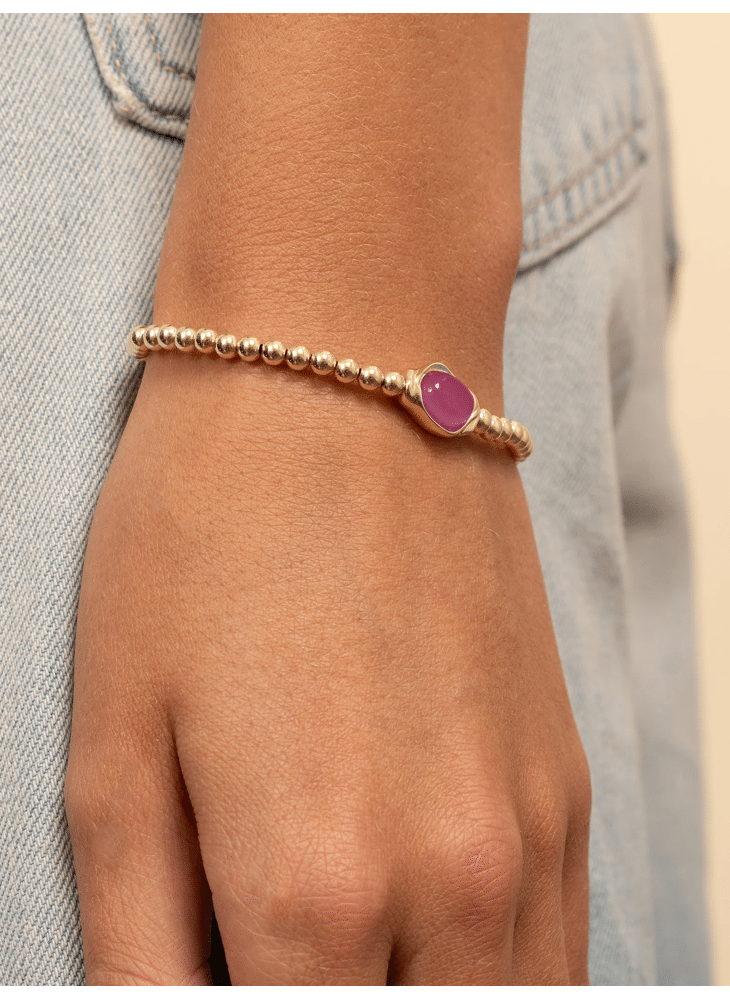 Flow Armband Candy Jade. Deze armband volgt de pols met zachte beweging, terwijl Candy Jade een heldere gloed toevoegt. De organische lijnen creëren een modern ritme dat je look licht houdt, zelfs in een gelaagde set met schakels, kralen en een horloge. Draag solo voor een fris focuspunt of bouw een armparty die textuur en kleur in balans brengt. De tint werkt prachtig met linnen, zijde en denim en geeft donkere outfits een speelse lift. De afwerking voelt glad en blijft comfortabel, van kantoor tot diner. Voor harmonie laat je de kleur subtiel terugkomen in oorbellen of een hanger. Een tijdloos, persoonlijk sieraad dat seizoen na seizoen een stralende, vrolijke noot aan je stijl toevoegt.