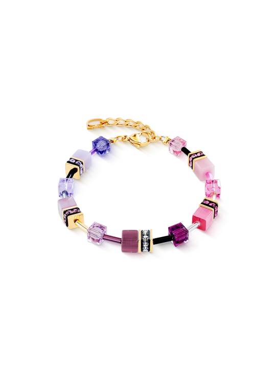 De GeoCUBE® Iconic roze-lila armband vangt de harmonie van roze en lila tinten en siert de pols op elegante wijze. Swarovski® kristallen, synthetisch tijgeroog en gekleurde glazen kubussen creëren een levendig samenspel van licht en kleur.
