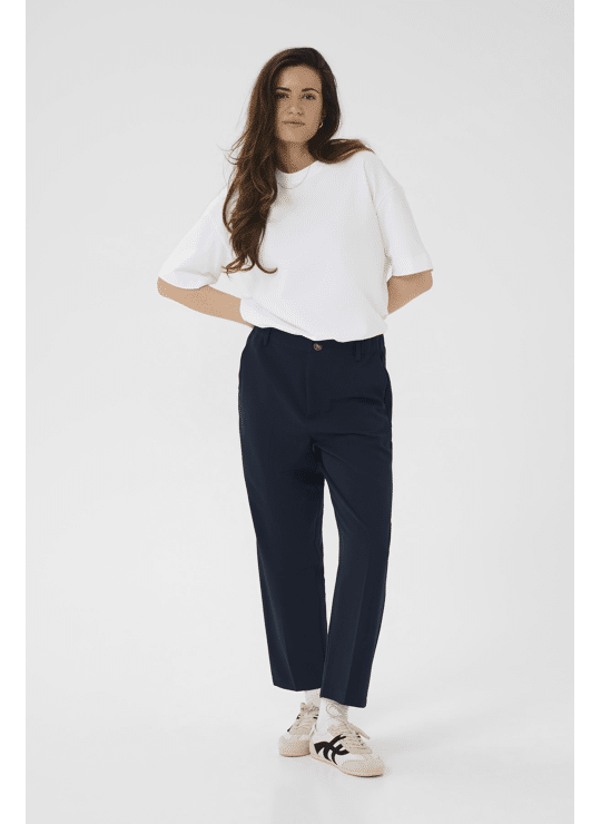Deze cropped broek heeft een rechte pijp, een getailleerde tailleband met lussen, een knoopsluiting en scherpe plooien aan de voorkant voor een strakke look.