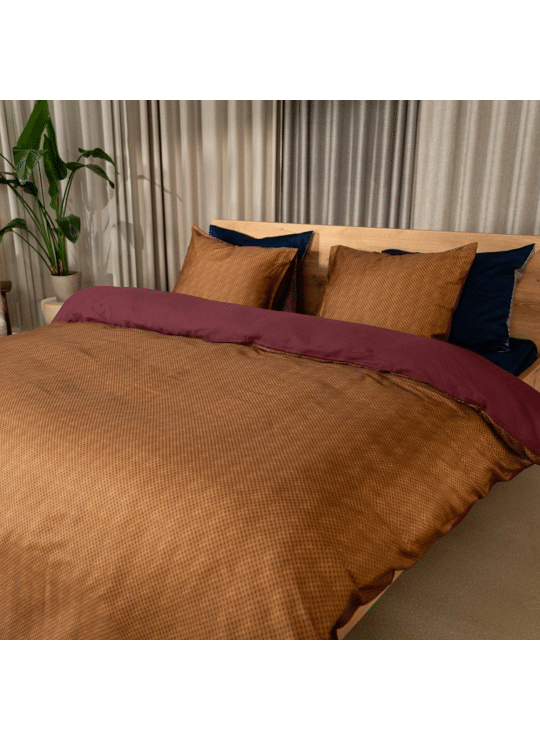 Breng rust en karakter in je slaapkamer met het dekbedovertrek Miyo. De voorzijde is voorzien van een print met warme koperbruine ruitjes. Deze subtiele ruitvormige lijnen creëren een herhalend ritme, waardoor het dessin rust en diepte geeft. Katoen-satijn voelt soepel en glad aan. Deze stof is heerlijk ademend en vriendelijk voor de huid.
