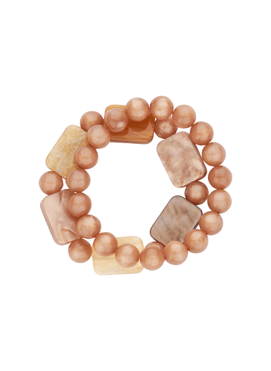 De KESIA armband in beige is een elegant statementstuk dat vlot combineert met elke outfit. Twee rijen glanzende kralen worden afgewisseld met karaktervolle rechthoekige stenen in hars. De warme tinten zorgen voor een zachte, vrouwelijke uitstraling.
