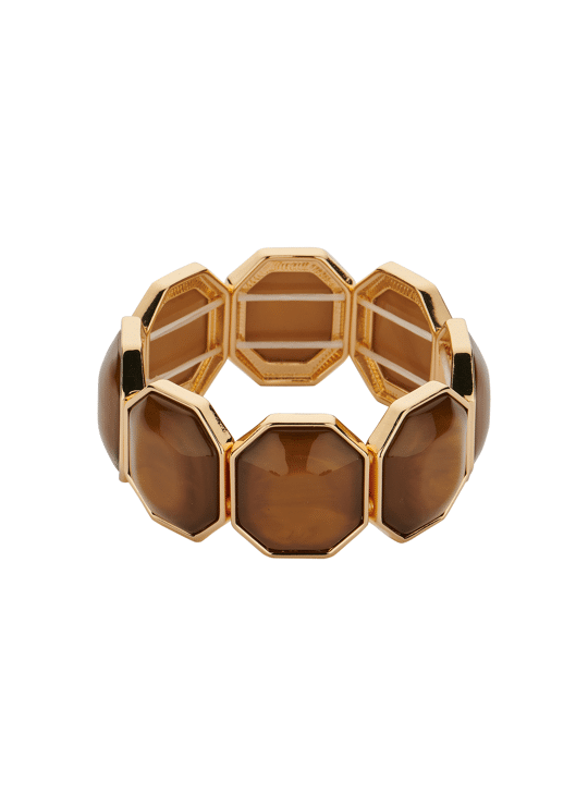 De KOLLI armband in bruin is elegant in zijn eenvoud. De hoekige harsstenen geven het ontwerp een moderne en krachtige vorm, terwijl het elastiek zorgt voor een comfortabele pasvorm. Combineer met de KOLLI halsketting en oorbellen voor een warme, gecoördineerde look.