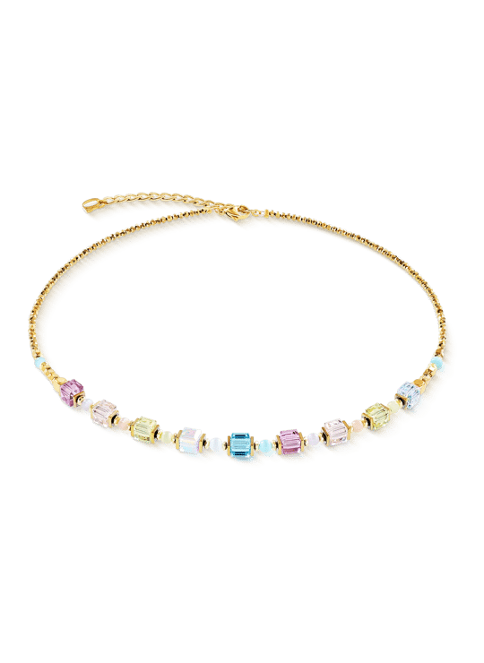 De Cube Aura pastelgouden ketting combineert strakke geometrische vormen met delicate pasteltinten. Fijn geslepen Swarovski® kristallen kubussen zijn nauwkeurig uitgelijnd en gescheiden door kleine kraaltjes die de lijnen verzachten en een vloeiende en lichte uitstraling geven.