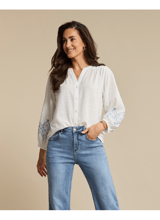 De Blouse & Embroidery is een blouse met een borduursel op de mouwen en een V-hals. De blouse heeft lange subtiele ballon mouwen en een regular fit.