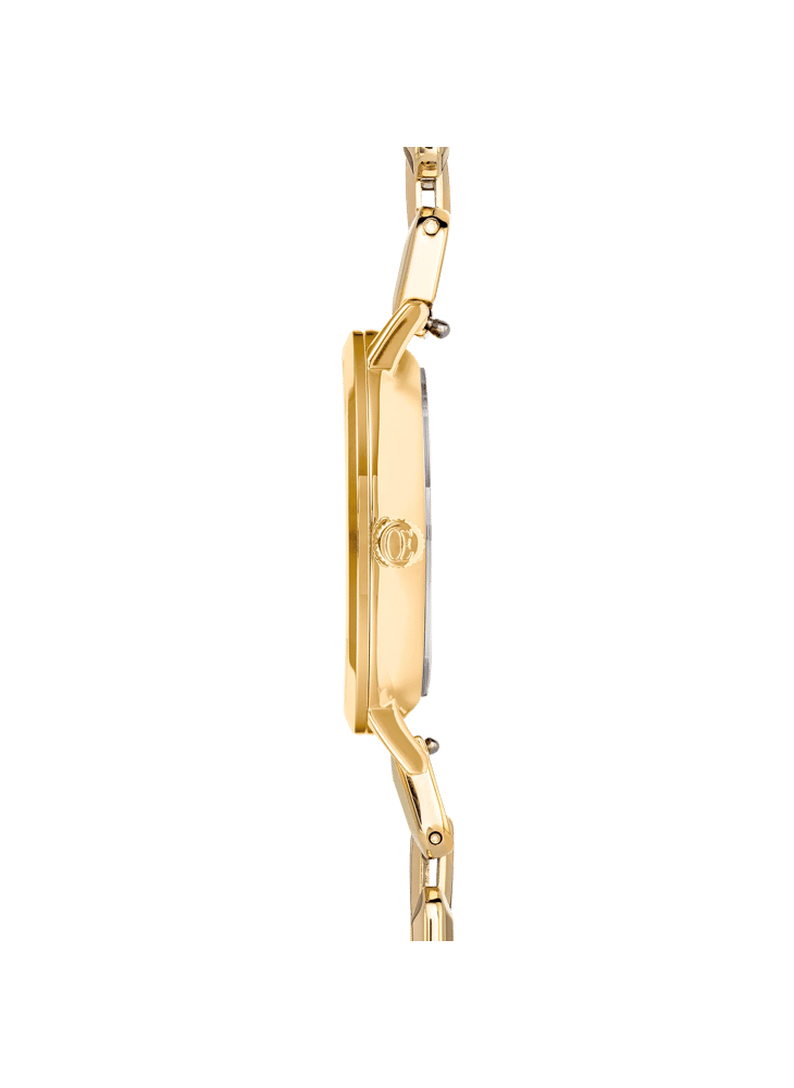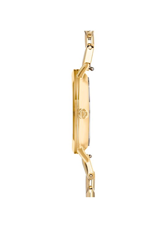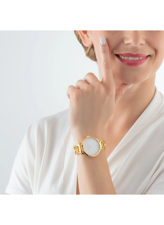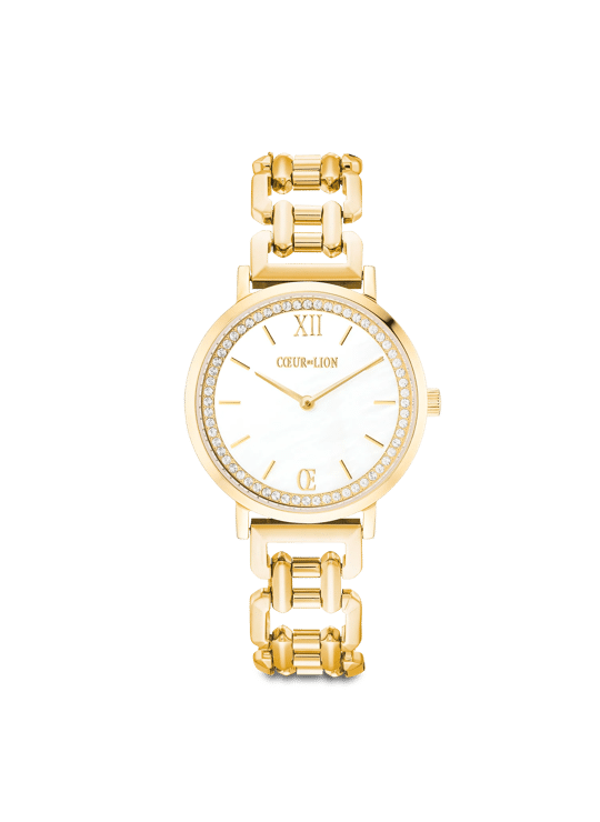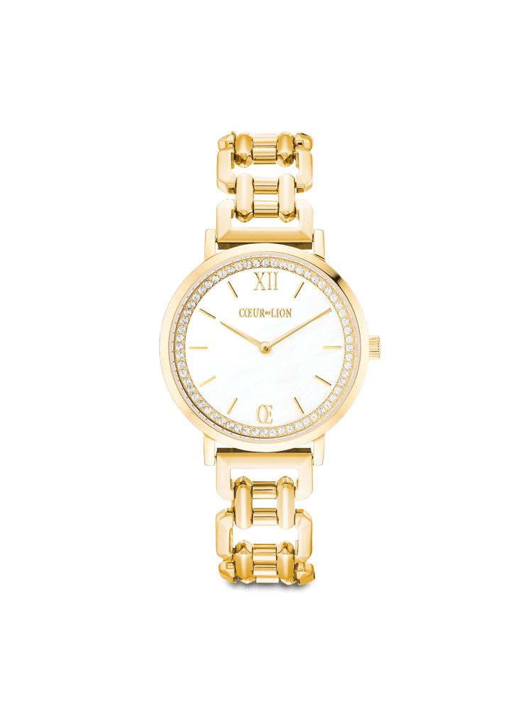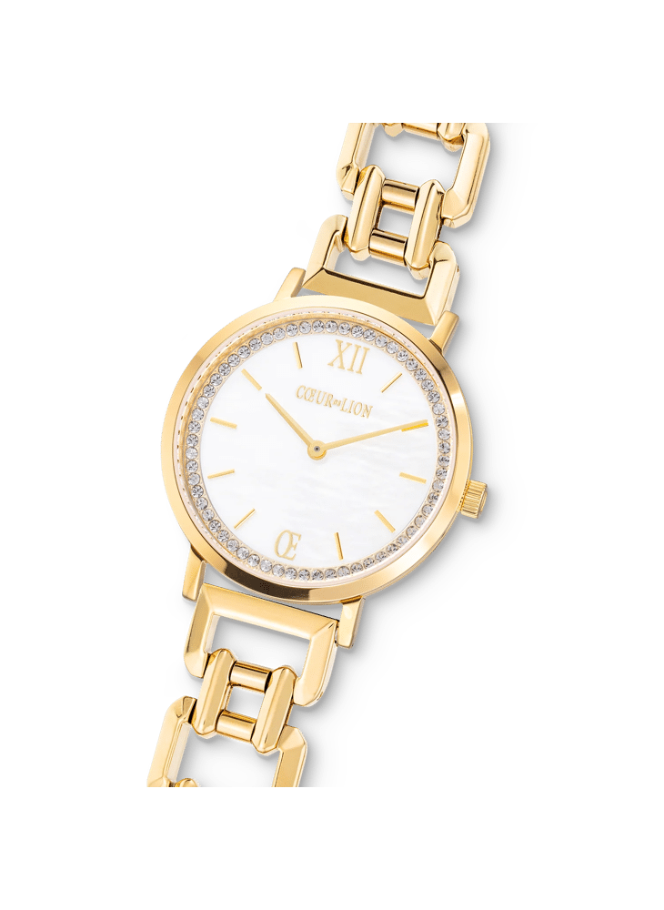 Sprankelend Pearlmutt Statement Gouden Ronde Horloge. Een horloge ontworpen voor unieke momenten. De wijzerplaat schittert met de warme glans van parelmoer, terwijl de rand is versierd met kleine, ton-sur-ton witte kristallen. Het luxueuze ontwerp van de SPARKLING WATCH in goudkleurig roestvrij staal is een echte blikvanger, en de gefacetteerde statement schakelband benadrukt de unieke elegantie verder. Of u hem nu alleen draagt of in combinatie met COEUR DE LION Pearl Edition sieraden met echte zoetwaterparels, dit model staat garant voor glamoureuze elegantie. Dit horloge heeft een hoogwaardige kast van 316L roestvrij staal, met een diameter van 34 mm en een dikte van slechts 7,5-7,8 mm, en is uitgerust met een premium Japans quartz-uurwerk dat wordt aangedreven door een 1,55V-batterij. Hoogwaardige geelgouden IP-plating. Eenvoudig te verstellen roestvrijstalen banden met gefacetteerde metalen schakels. Bandwissels zijn een fluitje van een cent dankzij een eenvoudig clipmechanisme.