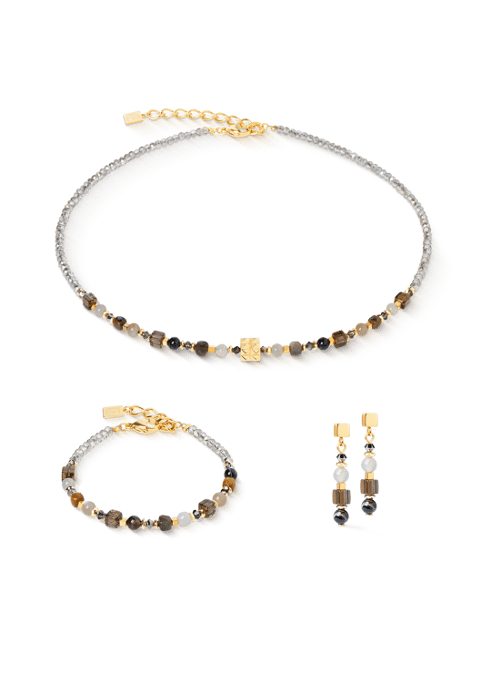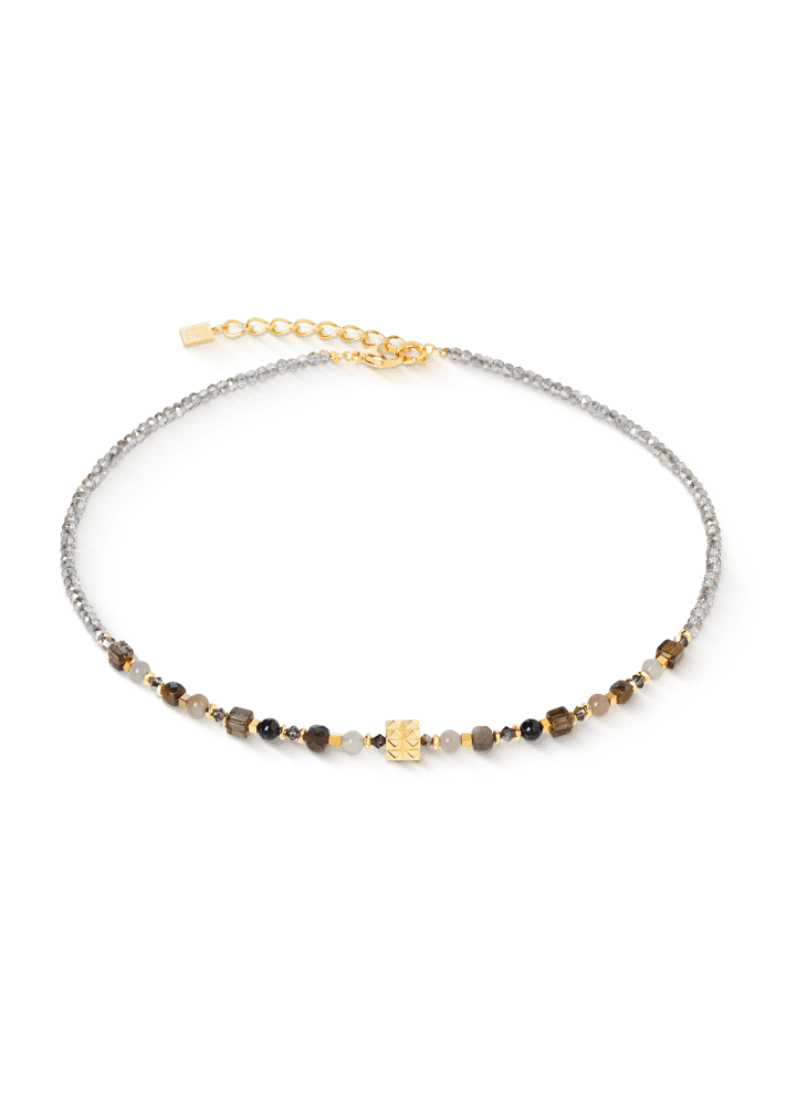 De Shape Mix Spikes Smoky Glow ketting combineert natuurlijke elegantie met een modern design. In het midden bevindt zich een vergulde roestvrijstalen Spikes kubus, geflankeerd door sprankelende Swarovski® kristallen en geselecteerde edelstenen zoals rookkwarts, chocolade maansteen, gestreepte onyx, agaat en tijgeroog. Het warme kleurenpalet met rookachtige en gouden tinten geeft de ketting een elegante diepte die bij diverse outfits past. Een expressief sieraad, handgemaakt in Duitsland.