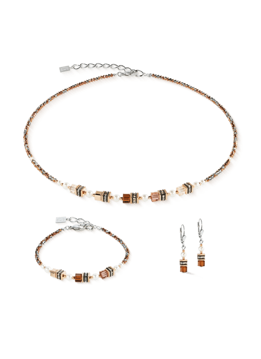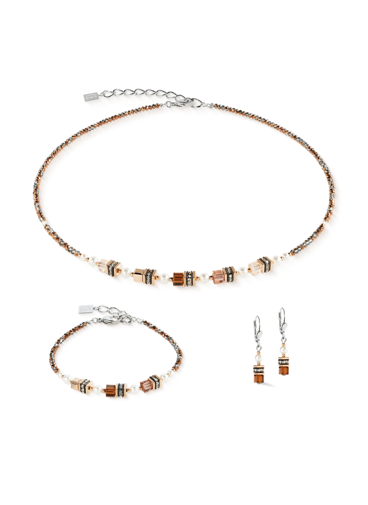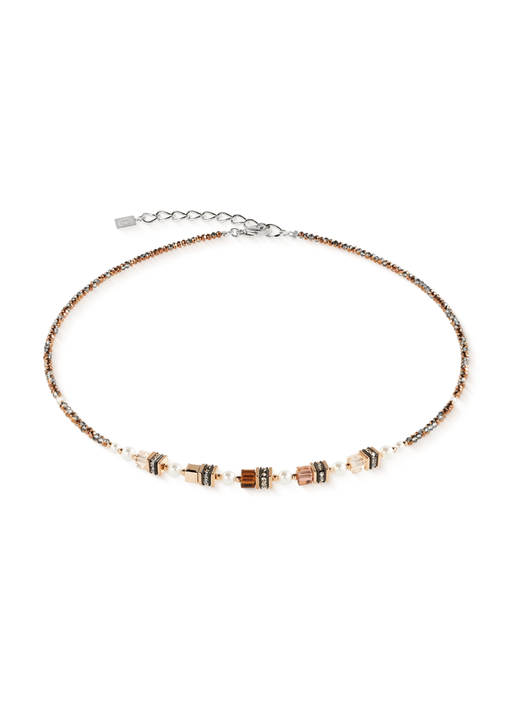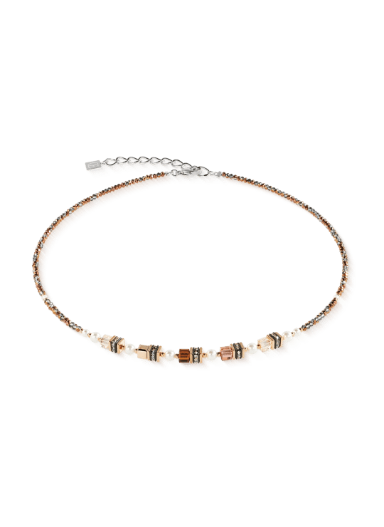 De Sparkling Princess ketting in de trendy kleur Mocha Mousse combineert harmonieus zachte bruintinten , glanzend roségoud en koel zilver . Edele blokjes en glinsterende parels