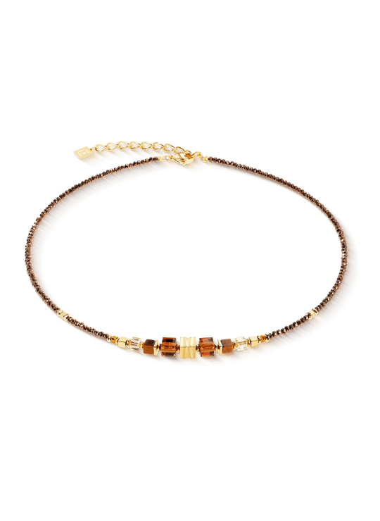 Het hart van dit prachtige ontwerp wordt gevormd door de kenmerkende Wave Cube, omlijst door gefacetteerde kristallen van warm amber, echt tijgeroog en briljant hematiet met een titaniumoxide finish. De harmonieuze goud- en bruintinten, samen met de delicate vergulde roestvrijstalen details, geven de ketting een tijdloze elegantie. Dit sieraad, handgemaakt in Duitsland, combineert een nauwkeurig ontwerp met hoogwaardige materialen, waardoor het het perfecte accessoire is voor een stijlvolle look.